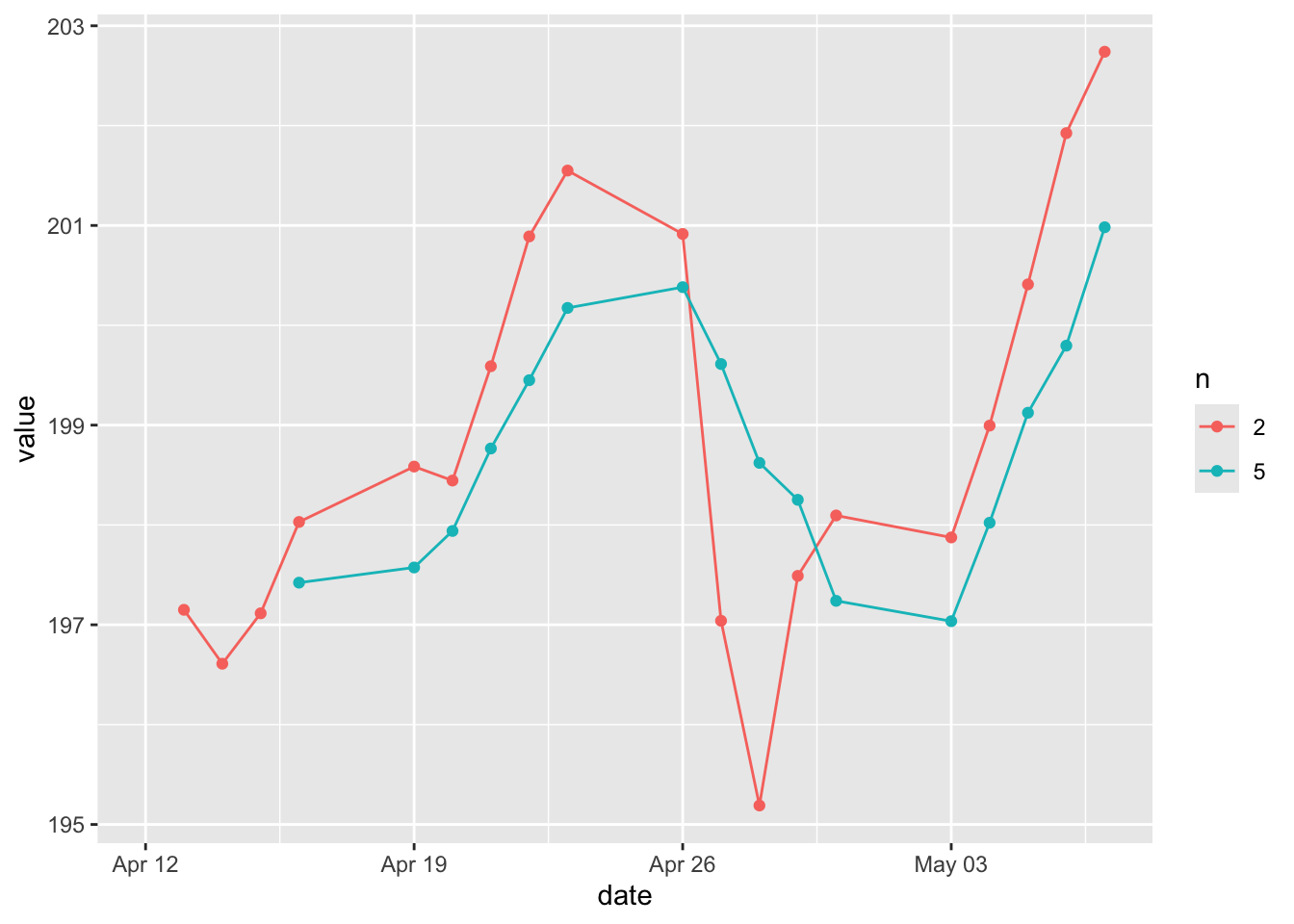 Here we have two simple moving averages in MMM subset. We reshape it to the long format to create the grouping variable n. We use color to differentiate the groups with colour = n.