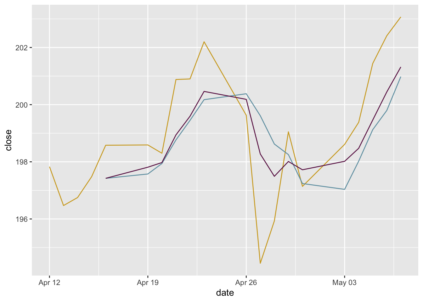 select(symbol, date, close, SMA_5, EMA_5)To overlay the lines, we simply add multiple geom_line() layers.